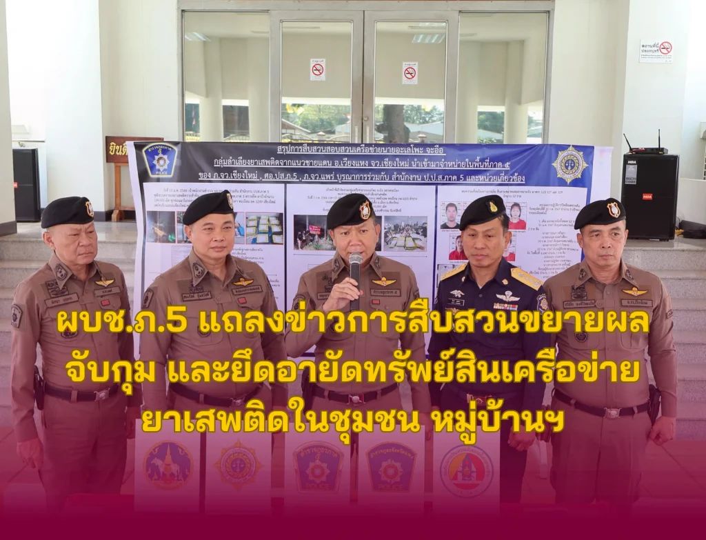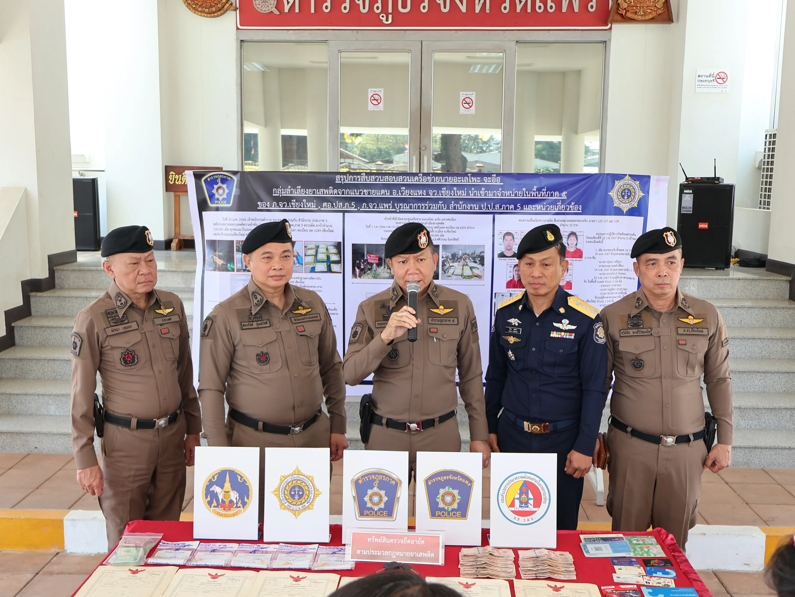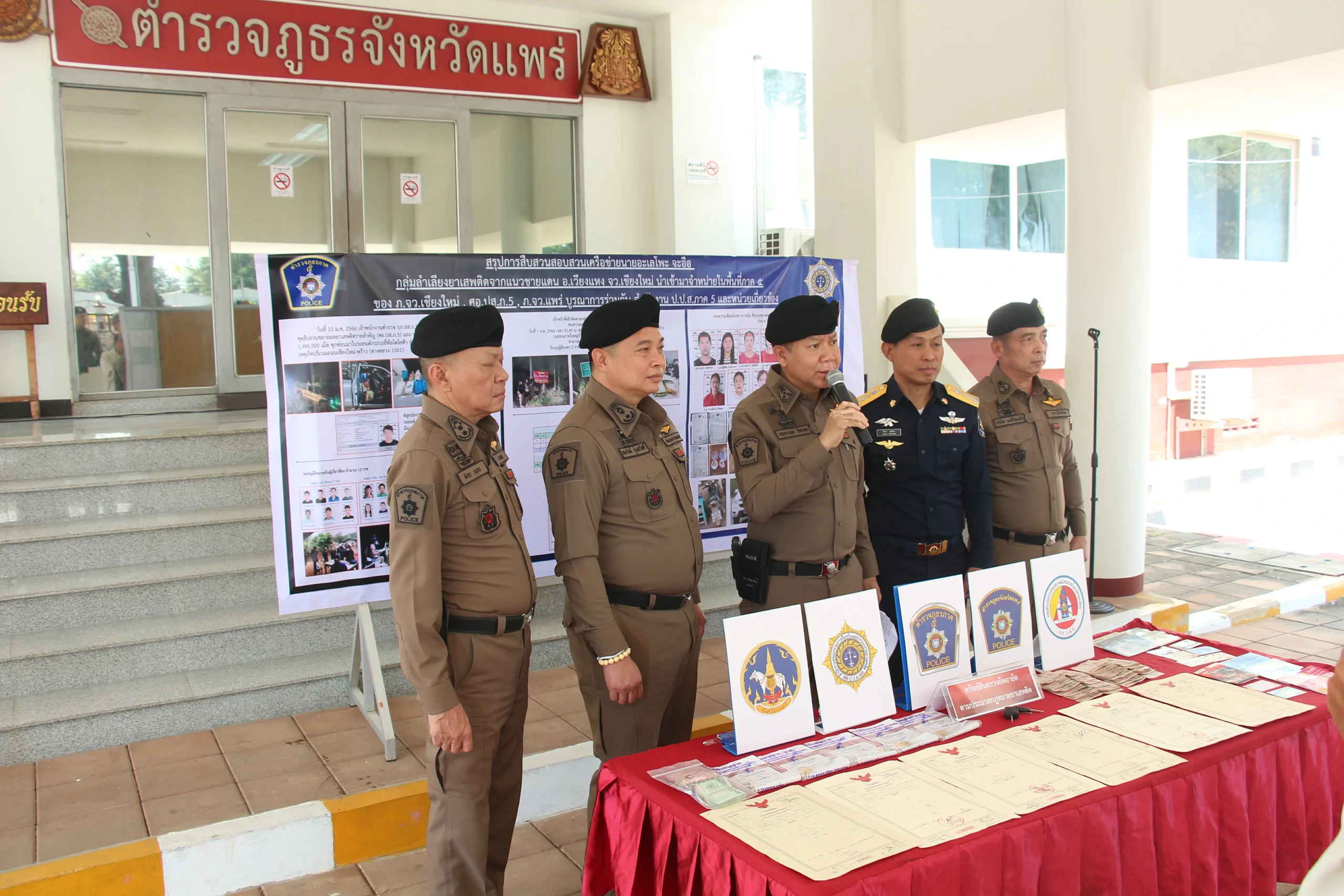 วันนี้ 22 ก.พ.67 พล.ต.ท.กฤตธาพล ยี่สาคร ผบช.ภ.5,พล.ต.ต.ธนะรัชต์ ชุ่มสวัสดิ์ รอง ผบช.ประจำฯ ช่วยราชการ ภ.5,พล.ต.ต.ธวัชชัย พงษ์วิวัฒนชัย ผบก.ภ.จว.เชียงใหม่,พล.ต.ต.พิชญา บุญขจร ผบก.ภ.จว.แพร่,เจ้าหน้าที่ ป.ป.ส.ภาค 5 พร้อมเจ้าหน้าที่ตำรวจ บก.สส.ภ.5, , กก.สส.ภ.จว.แพร่ ได้ร่วมกันแถลงข่าวการสืบสวนขยายผลจับกุมและตรวจยึดอายัดทรัพย์สิน เครือข่ายยาเสพติดในชุมชน หมู่บ้าน ที่รับยาเสพติดจากแนวชายแดนด้าน จว.เชียงใหม่ มาจำหน่ายในพื้นที่จังหวัดแพร่ สามารถจับกุมผู้ต้องหาตามหมายจับและตรวจยึดทรัพย์สินของผู้ต้องหาและผู้เกี่ยวข้องมาดำเนินการตามกฎหมาย ณ หน้าอาคารที่ทำการ ภ.จว.แพร่