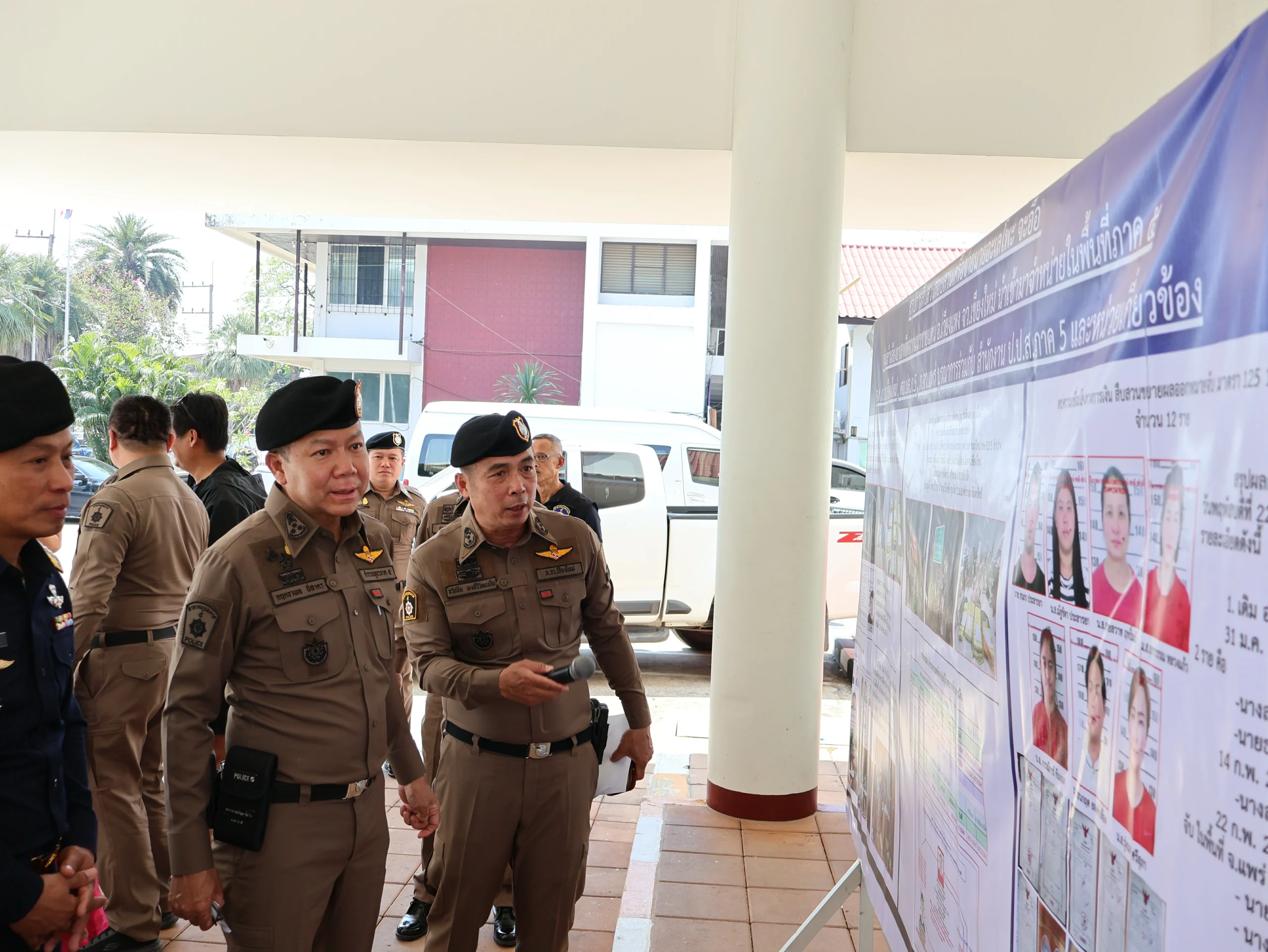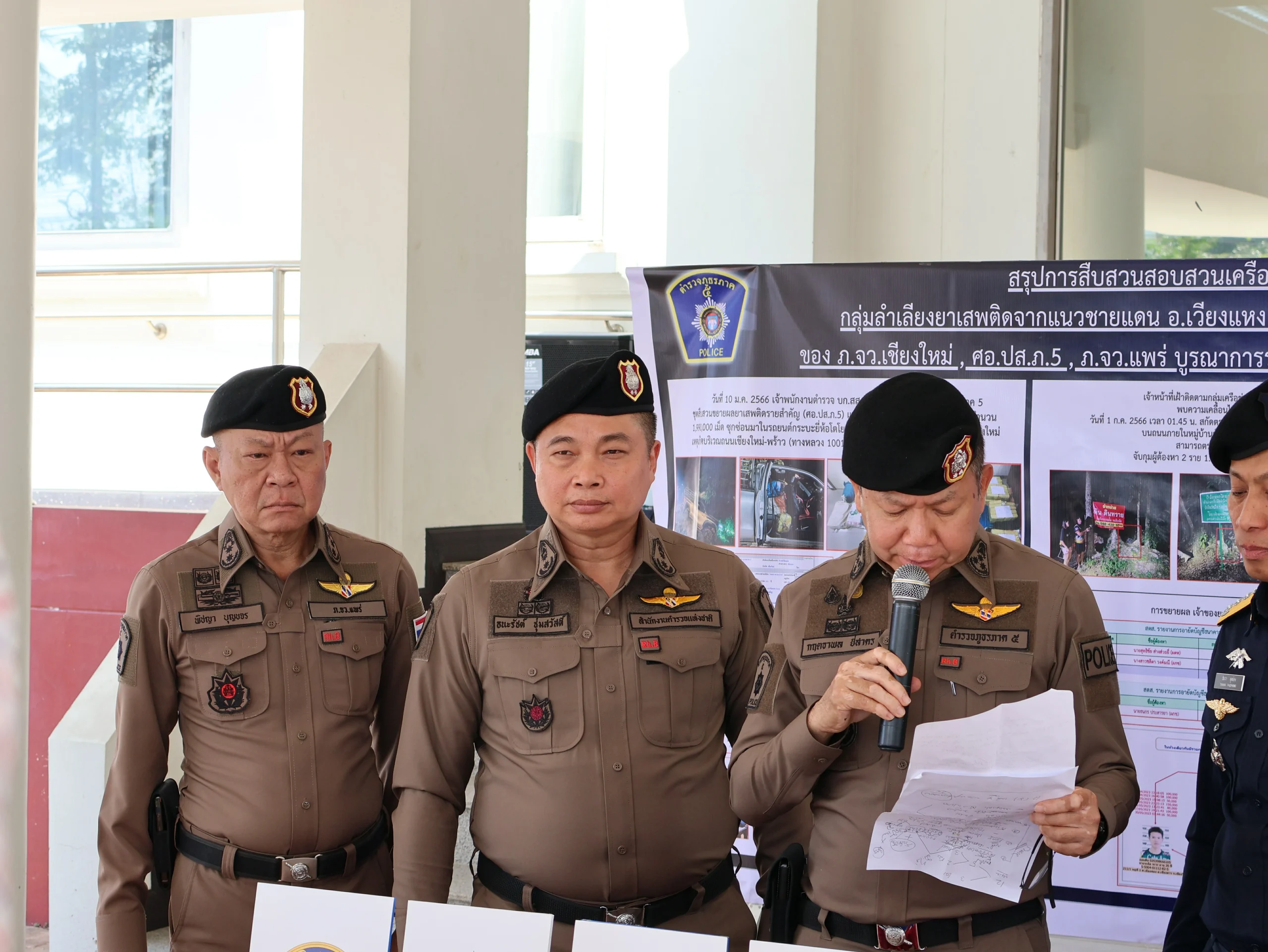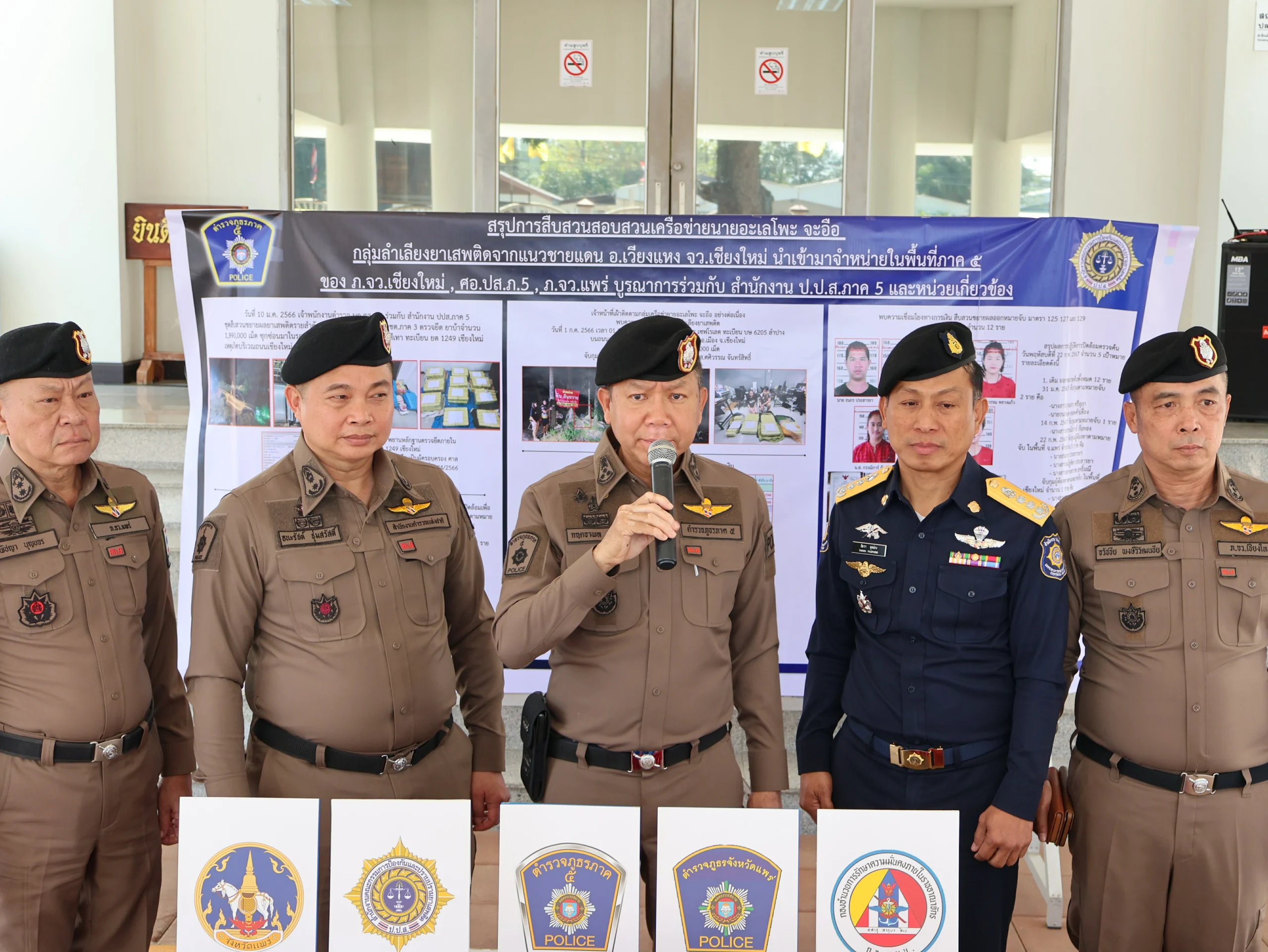 วันนี้ 22 ก.พ.67 พล.ต.ท.กฤตธาพล ยี่สาคร ผบช.ภ.5,พล.ต.ต.ธนะรัชต์ ชุ่มสวัสดิ์ รอง ผบช.ประจำฯ ช่วยราชการ ภ.5,พล.ต.ต.ธวัชชัย พงษ์วิวัฒนชัย ผบก.ภ.จว.เชียงใหม่,พล.ต.ต.พิชญา บุญขจร ผบก.ภ.จว.แพร่,เจ้าหน้าที่ ป.ป.ส.ภาค 5 พร้อมเจ้าหน้าที่ตำรวจ บก.สส.ภ.5, , กก.สส.ภ.จว.แพร่ ได้ร่วมกันแถลงข่าวการสืบสวนขยายผลจับกุมและตรวจยึดอายัดทรัพย์สิน เครือข่ายยาเสพติดในชุมชน หมู่บ้าน ที่รับยาเสพติดจากแนวชายแดนด้าน จว.เชียงใหม่ มาจำหน่ายในพื้นที่จังหวัดแพร่ สามารถจับกุมผู้ต้องหาตามหมายจับและตรวจยึดทรัพย์สินของผู้ต้องหาและผู้เกี่ยวข้องมาดำเนินการตามกฎหมาย ณ หน้าอาคารที่ทำการ ภ.จว.แพร่