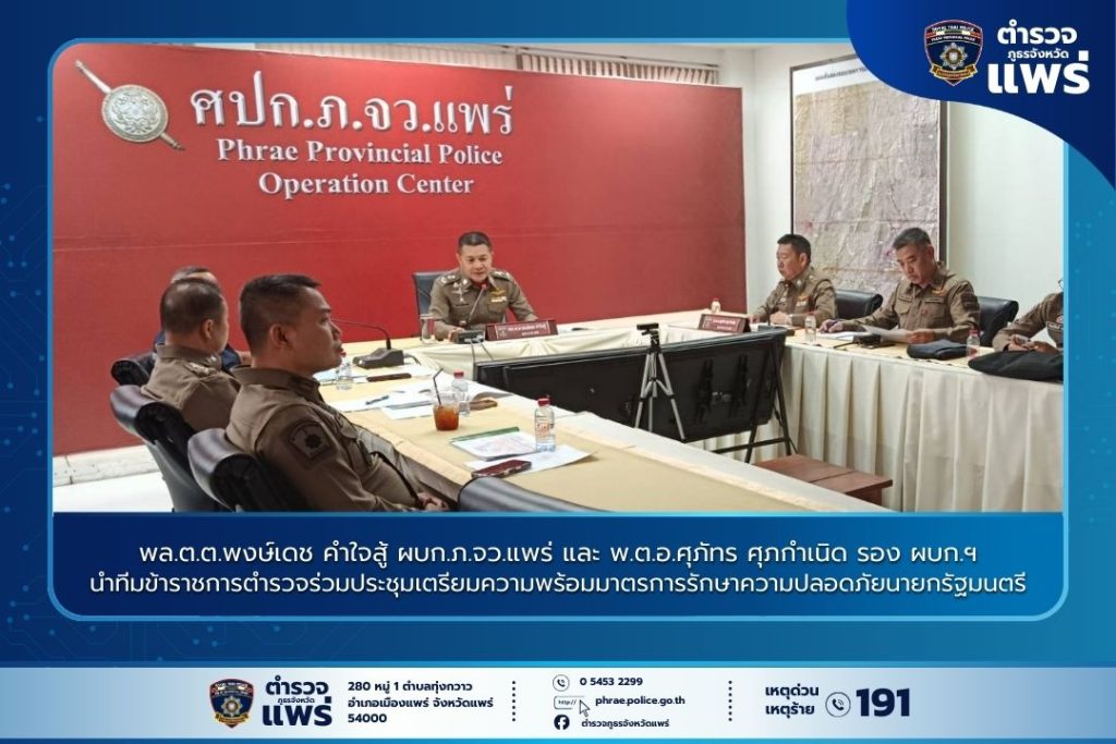 🖥️ ณ ห้องประชุม ศปก.ภ.จว.แพร่ พล.ต.ต.พงษ์เดช คำใจสู้ ผู้บังคับการตำรวจภูธรจังหวัดแพร่ พร้อมด้วย พ.ต.อ.ศุภัทร ศุภกำเนิด รองผู้บังคับการตำรวจภูธรจังหวัดแพร่ เป็นประธานและร่วมเฝ้าฟังการประชุมฯ โดยมีข้าราชการตำรวจระดับผู้บริหารในพื้นที่เข้าร่วมอย่างพร้อมเพรียง ประกอบด้วย พ.ต.อ.มนัส เกิดสุขโข ผกก.สส.ภ.จว.แพร่, พ.ต.อ.สุรชัย จันทรมณี ผกก.สภ.เมืองแพร่, พ.ต.อ.กุศลพันธุ์ สิงห์ใจ ผกก.สภ.พระธาตุช่อแฮ และ พ.ต.อ.พรหมมินทร์ อินทนันท์ ผกก.สภ.ห้วยม้า พร้อมด้วยเจ้าหน้าที่ผู้เกี่ยวข้อง เพื่อรับมอบนโยบายและซักซ้อมแนวทางแนวทางปฏิบัติในการบริหารจัดการพื้นที่และการรักษาความปลอดภัยในมิติต่าง ๆ 🤝