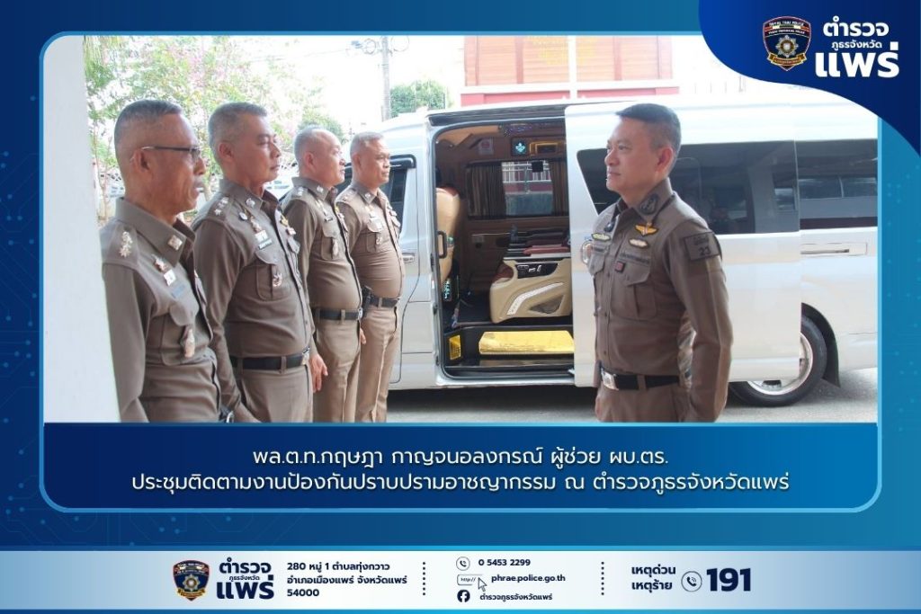 พล.ต.ท.กฤษฎา กาญจนอลงกรณ์ ผู้ช่วยผู้บัญชาการตำรวจแห่งชาติ (ปป 5) เดินทางมาปฏิบัติราชการเป็นประธานในการประชุมติดตามผลการปฏิบัติงานด้านการป้องกันปราบปรามอาชญากรรมของตำรวจภูธรจังหวัดแพร่ เพื่อเร่งรัดและเพิ่มประสิทธิภาพการปฏิบัติหน้าที่ในการดูแลความปลอดภัยในชีวิตและทรัพย์สินของประชาชน โดยมี พล.ต.ต.พงษ์เดช คำใจสู้ ผู้บังคับการตำรวจภูธรจังหวัดแพร่ พร้อมด้วยคณะรองผู้บังคับการ หัวหน้าสถานีตำรวจในสังกัด และข้าราชการตำรวจที่เกี่ยวข้องให้การต้อนรับและเข้าร่วมประชุมอย่างพร้อมเพรียงกัน