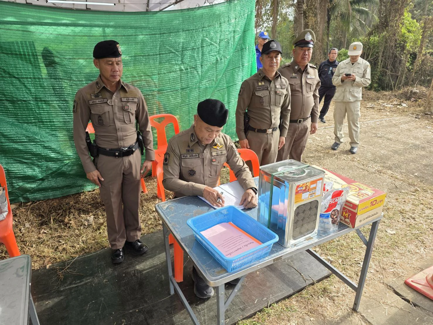 พร้อมด้วยเจ้าหน้าที่ตำรวจ เจ้าหน้าที่ฝ่ายปกครอง เจ้าหน้าที่สาธารณสุข และอาสาสมัคร ร่วมกันปฏิบัติหน้าที่ โดยรายงานสถานการณ์ทั่วไปเป็นไปด้วยความเรียบร้อย