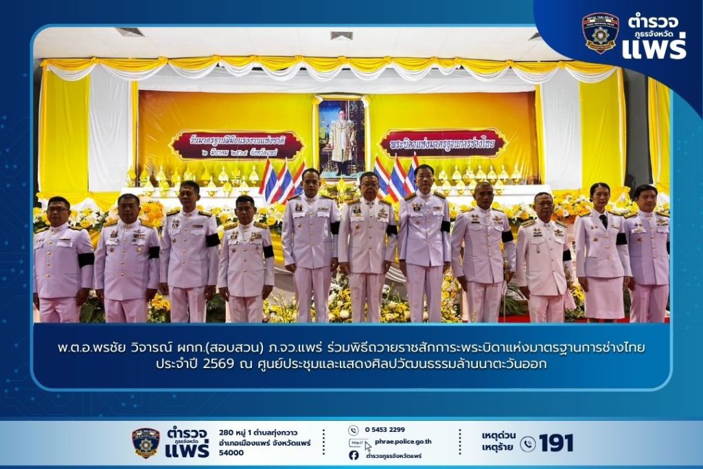 พ.ต.อ.พรชัย วิจารณ์ ผู้กำกับการ (สอบสวน) ตำรวจภูธรจังหวัดแพร่ พร้อมด้วย พ.ต.ท.เรืองศักดิ์ ต๊ะกิดุก สารวัตรฝ่ายอำนวยการ ตำรวจภูธรจังหวัดแพร่ เป็นผู้แทนหน่วยงานเข้าร่วมพิธีถวายราชสักการะแด่พระบาทสมเด็จพระบรมชนกาธิเบศร มหาภูมิพลอดุลยเดชมหาราช บรมนาถบพิตร ในฐานะ “พระบิดาแห่งมาตรฐานการช่างไทย” เนื่องในวันมาตรฐานฝีมือแรงงานแห่งชาติ เพื่อเป็นการน้อมรำลึกในพระมหากรุณาธิคุณอันหาที่สุดมิได้ที่มีต่อปวงชนชาวไทย โดยมี นายชัยสิทธิ์ ชัยสัมฤทธิ์ผล รองผู้ว่าราชการจังหวัดแพร่ เป็นประธานในพิธี พร้อมด้วยข้าราชการพลเรือน ทหาร ตำรวจ และพสกนิกรทุกหมู่เหล่าเข้าร่วมพิธีอย่างพร้อมเพรียง