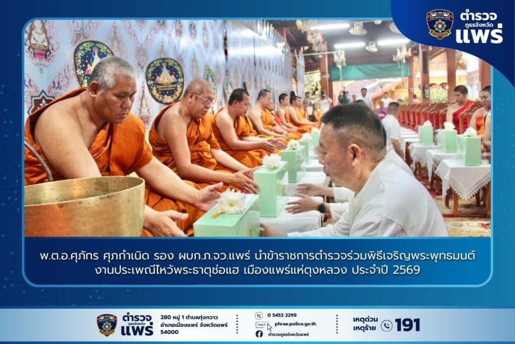 พล.ต.ต.พงษ์เดช คำใจสู้ ผู้บังคับการตำรวจภูธรจังหวัดแพร่ มอบหมายให้ พ.ต.อ.ศุภัทร ศุภกำเนิด รองผู้บังคับการตำรวจภูธรจังหวัดแพร่ เป็นผู้แทนนำคณะข้าราชการตำรวจ ประกอบด้วย ผู้กำกับการสืบสวนตำรวจภูธรจังหวัดแพร่ ผู้กำกับการ (สอบสวน) ตำรวจภูธรจังหวัดแพร่ หัวหน้าสถานีตำรวจในสังกัด และข้าราชการตำรวจฝ่ายอำนวยการ ชุดที่ 3 และชุดที่ 4 เข้าร่วมพิธีเจริญพระพุทธมนต์ เนื่องในงานประเพณีไหว้พระธาตุช่อแฮ เมืองแพร่แห่ตุงหลวง ประจำปี 2569 เพื่อความเป็นสิริมงคลและสืบสานวัฒนธรรมประเพณีอันศักดิ์สิทธิ์ของจังหวัดแพร่