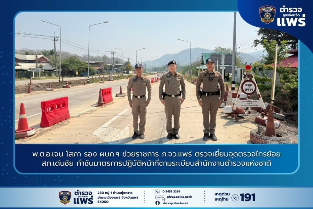 พ.ต.อ.เจน โสภา รอง ผบก.ฯ ช่วยราชการ ภ.จว.แพร่ ตรวจเยี่ยมจุดตรวจไทรย้อย สภ.เด่นชัย กำชับมาตรการปฏิบัติหน้าที่ตามระเบียบสำนักงานตำรวจแห่งชาติ