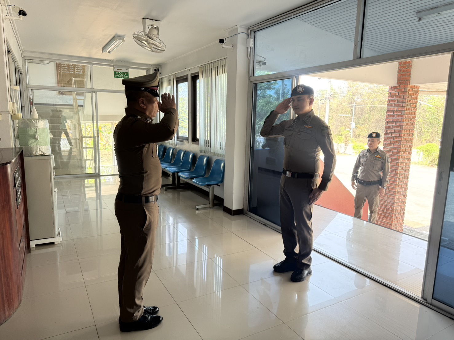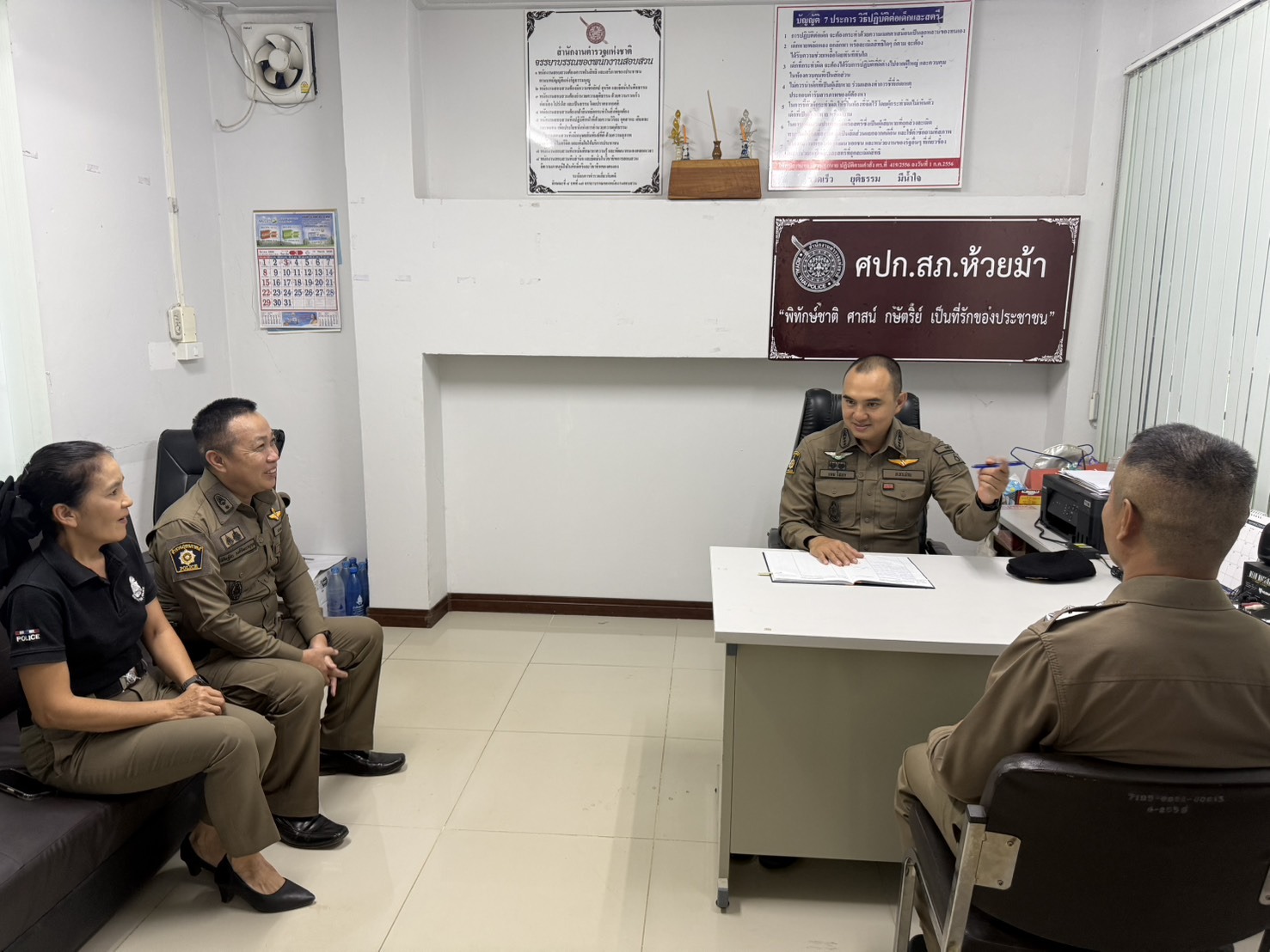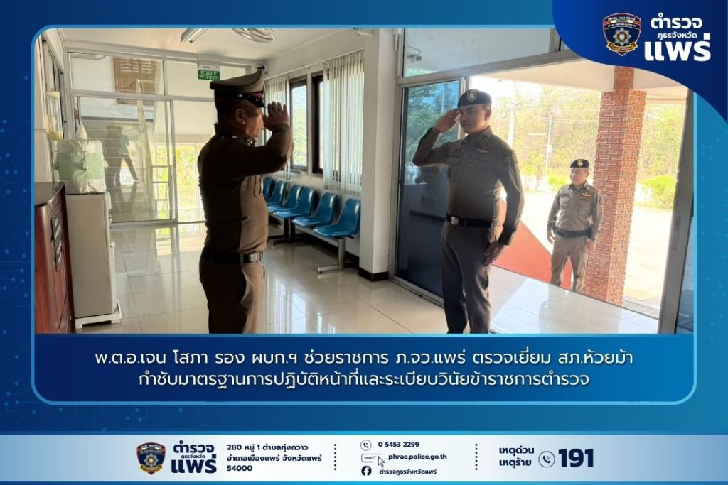 วันที่ 📅 9 มีนาคม 2569 ⏰ เวลา 11.50 น. พ.ต.อ.เจน โสภา รองผู้บังคับการฯ ช่วยราชการกองบังคับการตำรวจภูธรจังหวัดแพร่ เดินทางตรวจเยี่ยมสถานีตำรวจภูธรห้วยม้า เพื่อติดตามการปฏิบัติราชการและมอบนโยบายแก่ข้าราชการตำรวจในสังกัด โดยมี พ.ต.ท.วีระ แสงจันทร์ รองผู้กำกับการป้องกันปราบปราม, พ.ต.ท.ทวีศักดิ์ ตุ้ยบุญมา รองผู้กำกับการสืบสวน, พ.ต.ท.สมบัติ ชุมภูอินทร์ รองผู้กำกับการ (สอบสวน), พ.ต.ท.อนันต์ สมบัติ สารวัตร (สอบสวน), พ.ต.ท.หญิง นงลักษณ์ เวียงนาค สารวัตรฝ่ายอำนวยการ พร้อมด้วยเจ้าหน้าที่ตำรวจอยู่ปฏิบัติหน้าที่ให้การต้อนรับ ณ 📍 สถานีตำรวจภูธรห้วยม้า จังหวัดแพร่