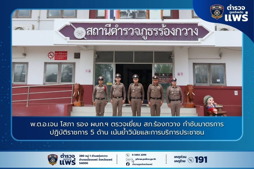 ตำรวจภูธรจังหวัดแพร่ลงพื้นที่ตรวจติดตามการปฏิบัติราชการ เพื่อยกระดับมาตรฐานการทำงานของสถานีตำรวจในสังกัด โดยเมื่อวันที่ 24 กุมภาพันธ์ 2569 เวลา 14.30 น. พ.ต.อ.เจน โสภา รอง ผบก.ฯ ช่วยราชการ ภ.จว.แพร่ ได้เดินทางเข้าตรวจเยี่ยมสถานีตำรวจภูธรร้องกวาง เพื่อมอบนโยบายและกำชับแนวทางการปฏิบัติหน้าที่ให้เป็นไปตามระเบียบของสำนักงานตำรวจแห่งชาติ ณ สถานีตำรวจภูธรร้องกวาง จ.แพร่
