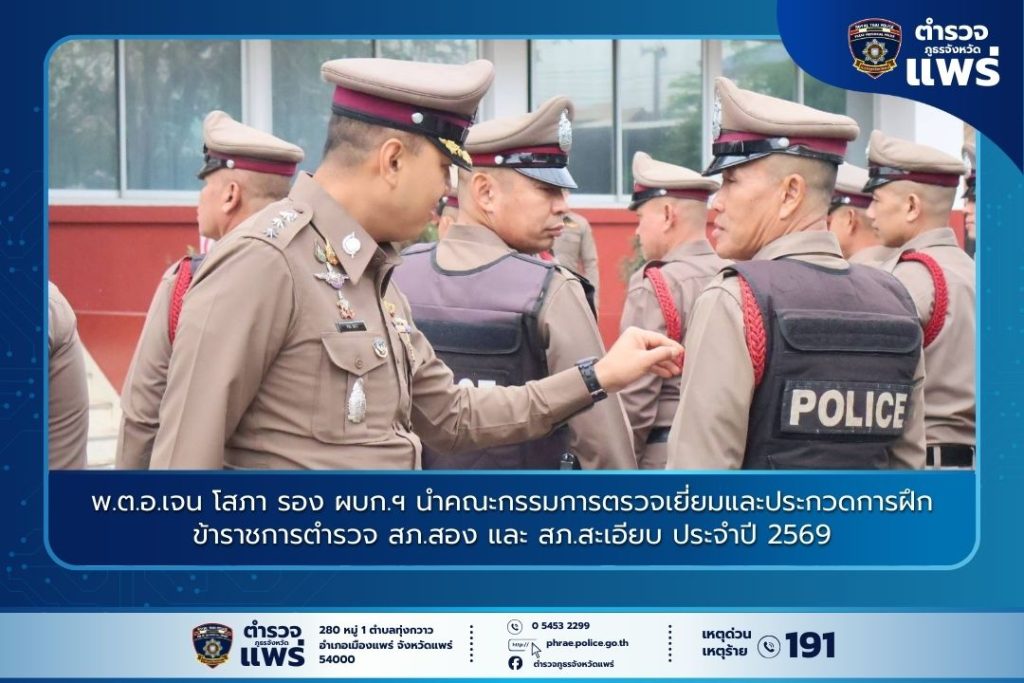 ตำรวจภูธรจังหวัดแพร่ มุ่งเน้นการเสริมสร้างระเบียบวินัยและทักษะยุทธวิธีเพื่อความปลอดภัยของประชาชน โดยเมื่อวันที่ 24 กุมภาพันธ์ 2569 เวลา 09.00 น. พ.ต.อ.เจน โสภา รอง ผบก.ฯ ช่วยราชการ ภ.จว.แพร่ เดินทางเป็นประธานออกตรวจตามแผนการฝึกและการประกวดการฝึกประจำปี พ.ศ. 2568 ของสถานีตำรวจในสังกัด เพื่อตรวจสอบความพร้อมและความเชี่ยวชาญในการปฏิบัติหน้าที่ ณ ลานฝึกหน้าที่ทำการ สภ.สอง จ.แพร่