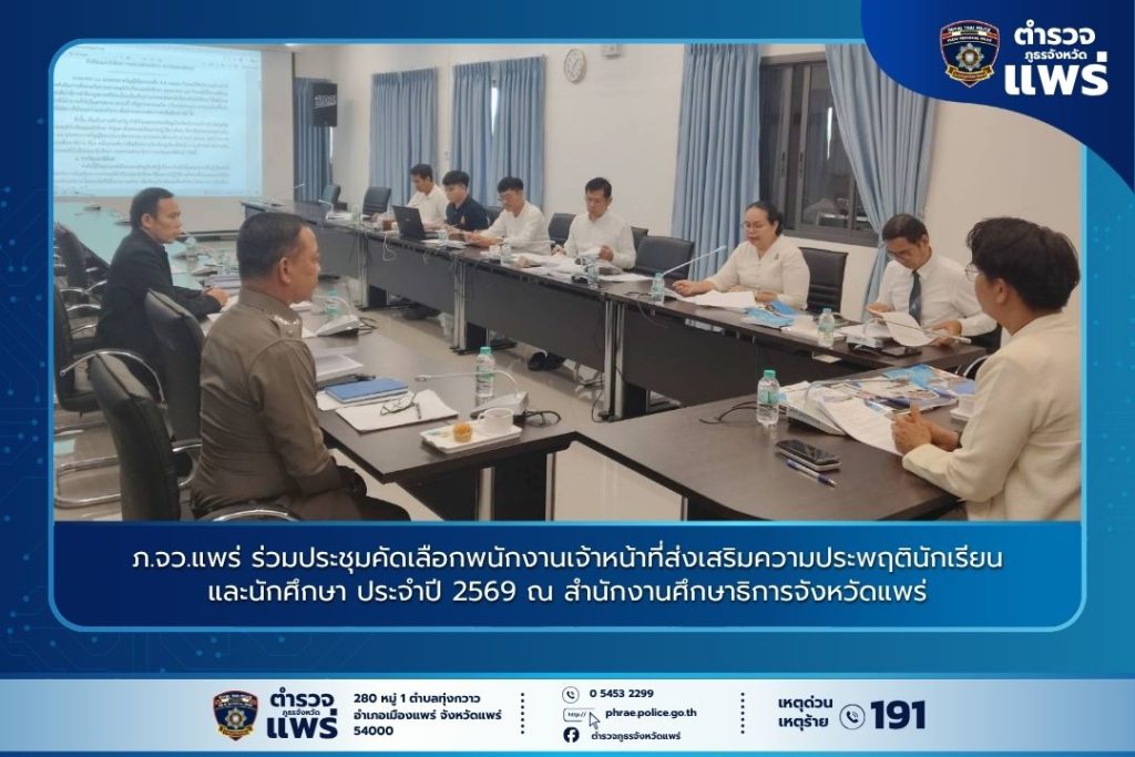 13.00 น. พ.ต.อ.พรชัย วิจารณ์ ผกก.(สอบสวน) กลุ่มงานสอบสวน ตำรวจภูธรจังหวัดแพร่ ได้รับมอบหมายจากผู้บังคับบัญชาให้เข้าร่วมการประชุมคณะกรรมการคัดเลือกพนักงานเจ้าหน้าที่ส่งเสริมความประพฤตินักเรียนและนักศึกษากระทรวงศึกษาธิการ เพื่อรับรางวัล “สมาพิทักษ์” ประจำปีงบประมาณ พ.ศ. 2569