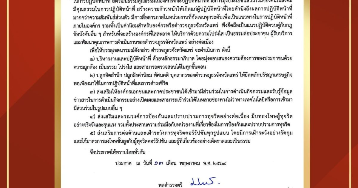เจตนารมณ์ในการป้องกันการทุจริตของตำรวจภูธรจังหวัดแพร่