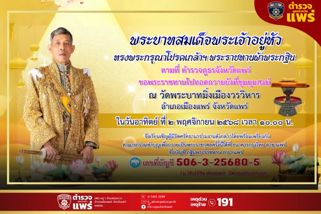 👑 āļ‚āļ­āđ€āļŠāļīāļāļĢāđˆāļ§āļĄāļžāļīāļ˜āļĩāļ–āļ§āļēāļĒāļœāđ‰āļēāļžāļĢāļ°āļāļāļīāļ™āļžāļĢāļ°āļĢāļēāļŠāļ—āļēāļ™ āļ•āļģāļĢāļ§āļˆāļ āļđāļ˜āļĢāļˆāļąāļ‡āļŦāļ§āļąāļ”āđāļžāļĢāđˆ āļ›āļĢāļ°āļˆāļģāļ›āļĩ āļž.āļĻ. 2568