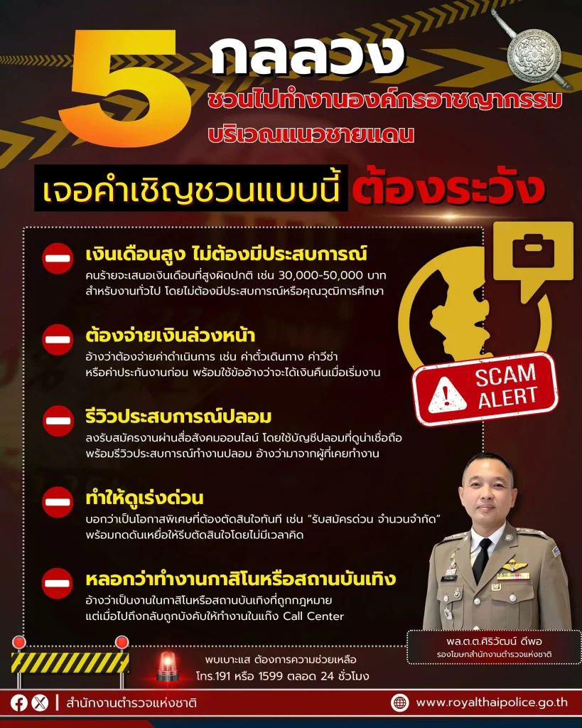 สำนักงานตำรวจแห่งชาติจึงขอตีแผ่ 5 กลลวงมิจฉาชีพที่หลอกลวงพี่น้องประชาชนให้ไปทำงานในองค์กรอาชญากรรมบริเวณแนวชายแดน ดังนี้
