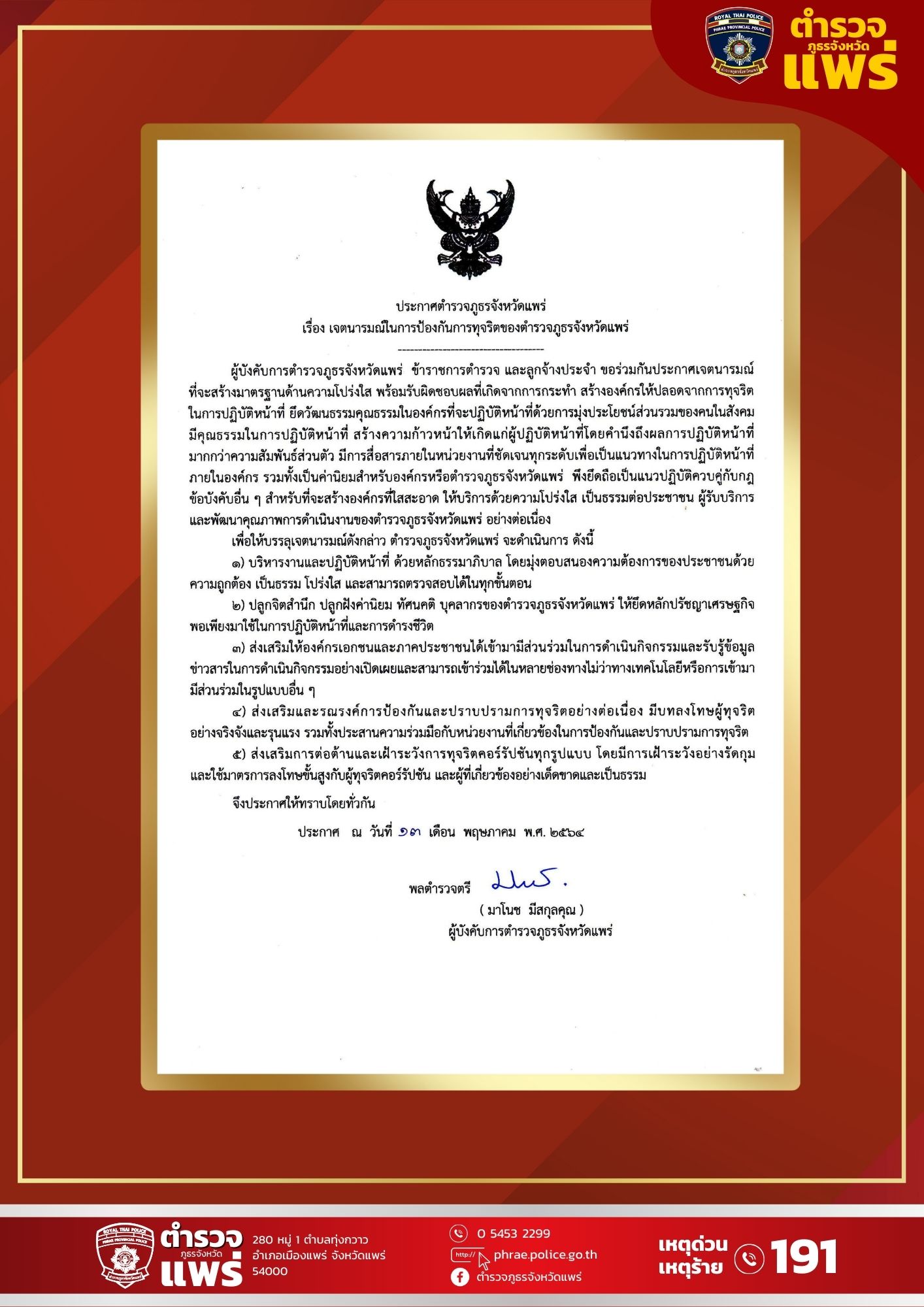 เจตนารมณ์ในการป้องกันการทุจริตของตำรวจภูธรจังหวัดแพร่