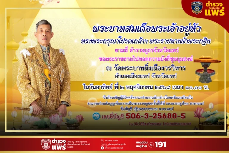 ข่าวกิจกรรม 6 ตุลาคม 2568 183 👑 ขอเชิญร่วมพิธีถวายผ้าพระกฐินพระราชทาน ตำรวจภูธรจังหวัดแพร่ ประจำปี พ.ศ. 2568 ด้วย พระบาทสมเด...